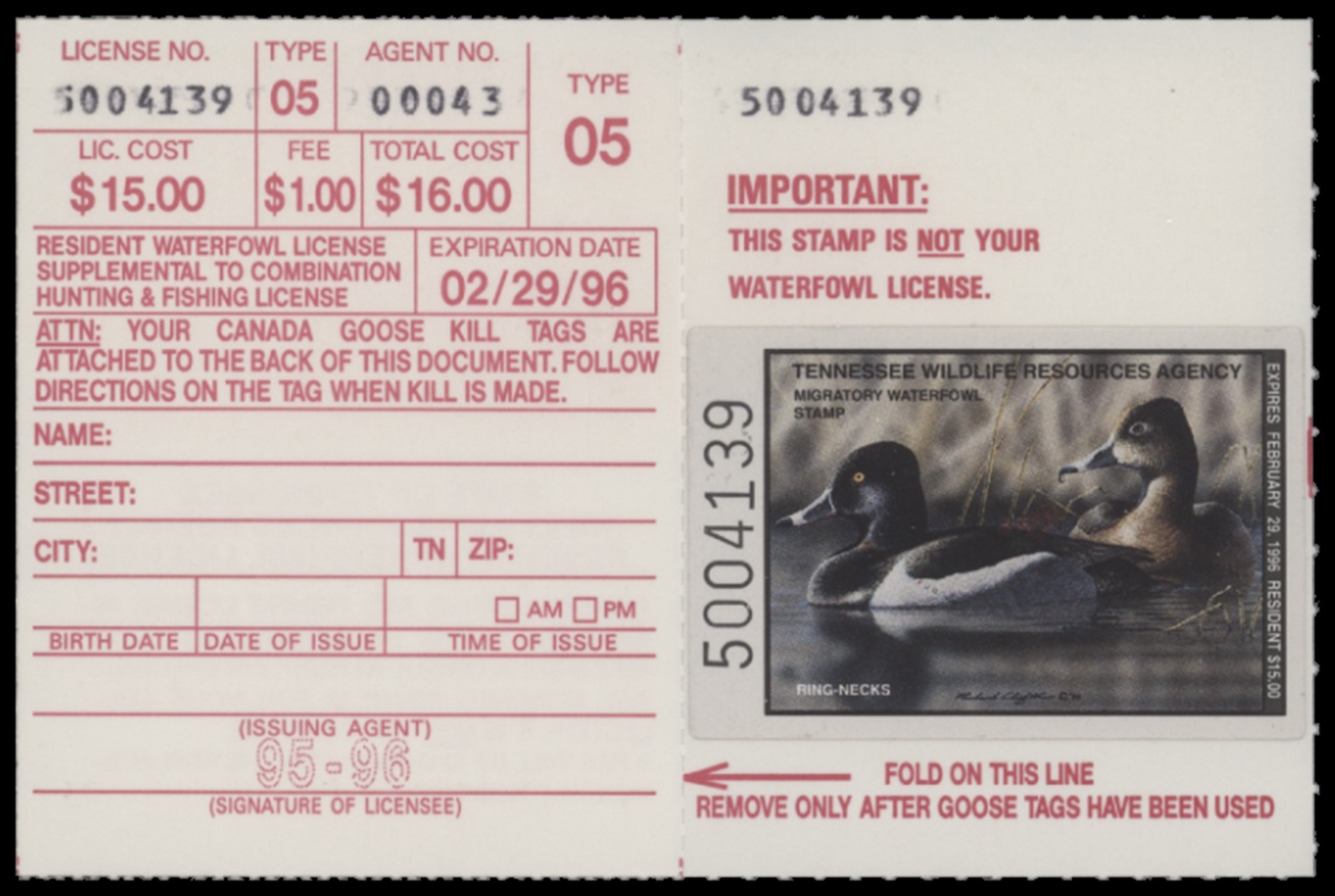 TN17 1995 State Duck Stamp. Mint Never Hinged. Very Fine. Pintail & Decoy by Phillip Crowe.