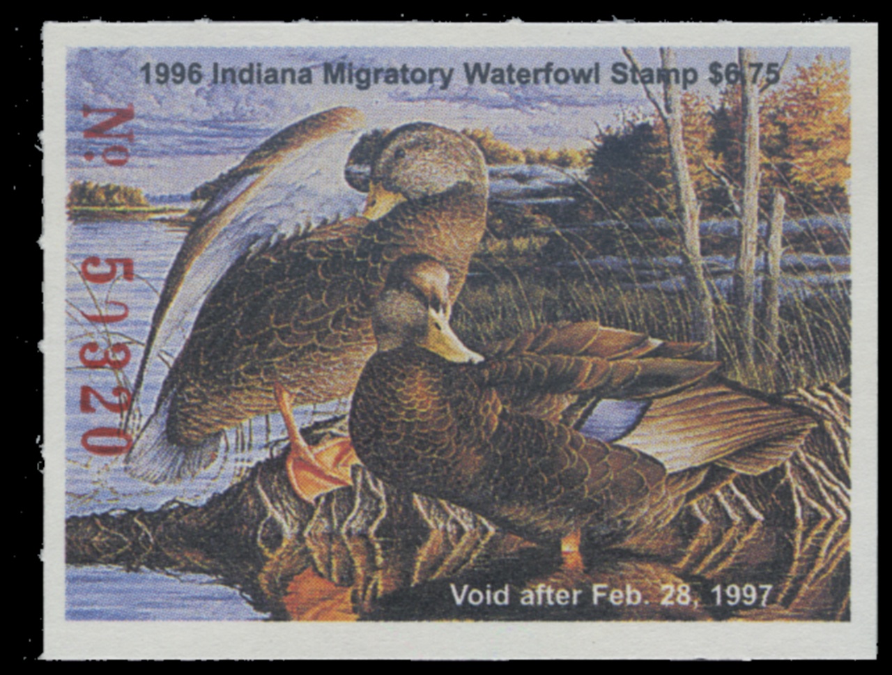 IN21 1996 State Duck Stamp. Mint Never Hinged. Very Fine. Black Ducks by Chuck Riggles.