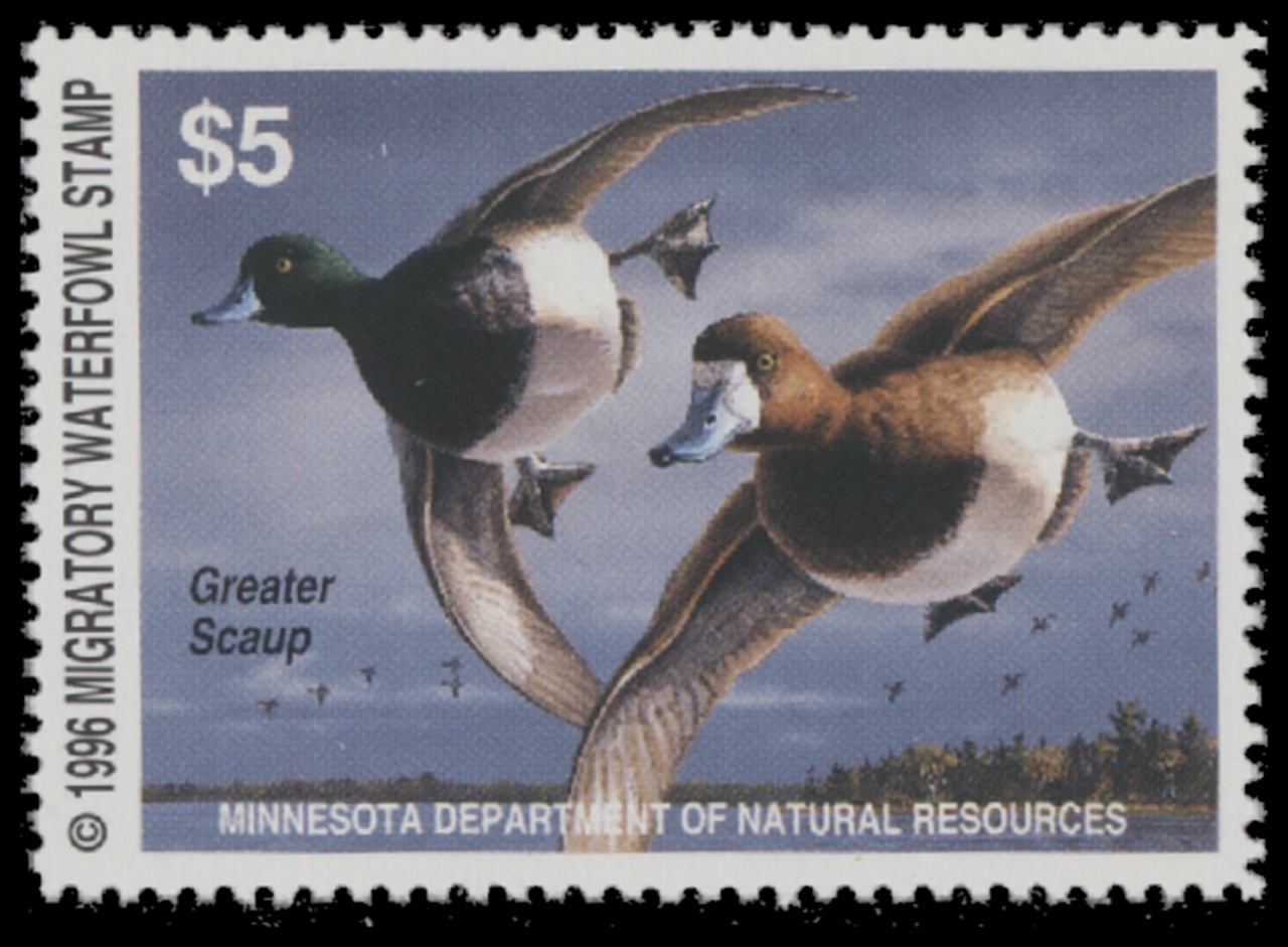 MN20 1996 State Duck Stamp. Mint Never Hinged. Very Fine. Scaup by Jim Hautman.