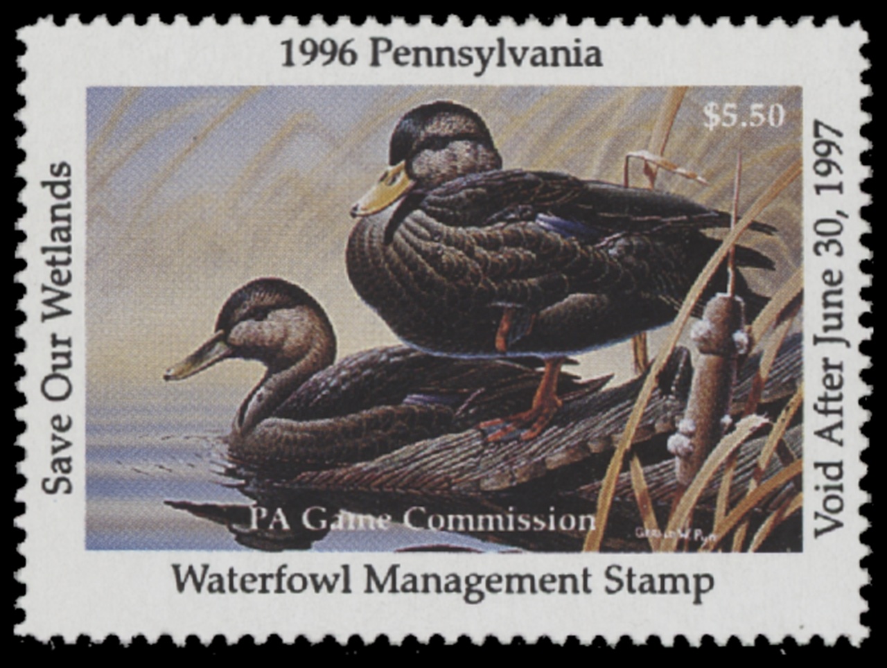 PA14 1996 State Duck Stamp. Mint Never Hinged. Very Fine. Black Ducks by Gerald Putt.