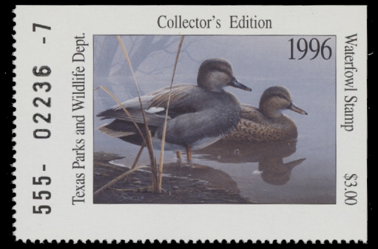 TX16 1996 State Duck Stamp. Mint Never Hinged. Very Fine. Gadwall Pair by Dan Smith.