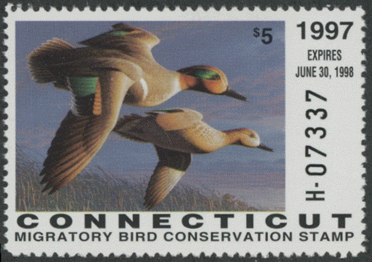 CT5 1997 State Duck Stamp. Mint Never Hinged. Very Fine. Green-wing Teal by Robert Steiner. Hunter Type (S/N prefix H)