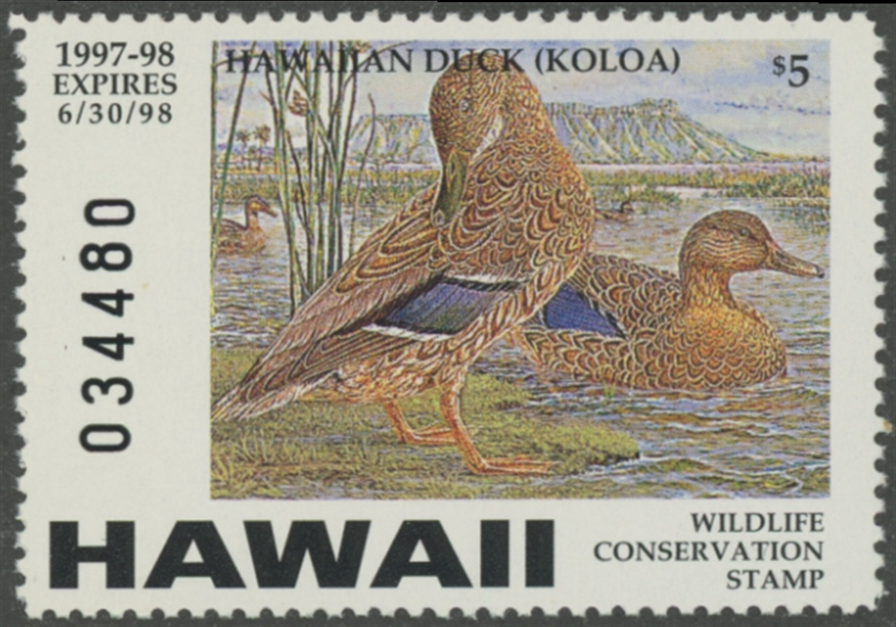 HI2 1997 State Duck Stamp. Mint Never Hinged. Very Fine. Hawaiian Duck by Danial Van Zyle.