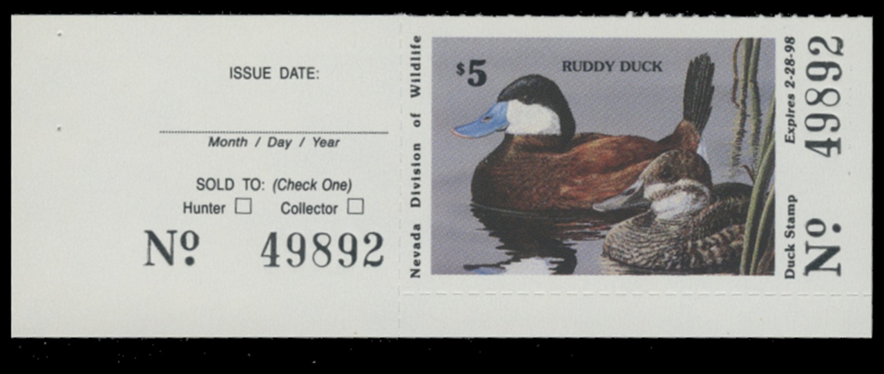NV19 1997 State Duck Stamp. Mint Never Hinged. Very Fine. Ruddy Ducks on Pond by Brian Blight.