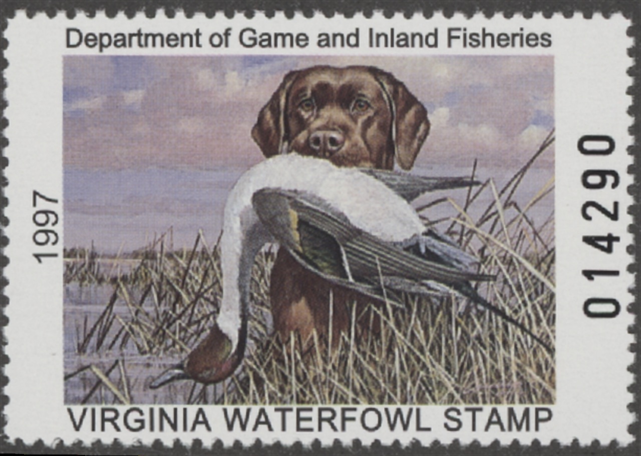 VA10 1997 State Duck Stamp. Mint Never Hinged. Very Fine. Retriever & Pintail by Roger Cruwys.