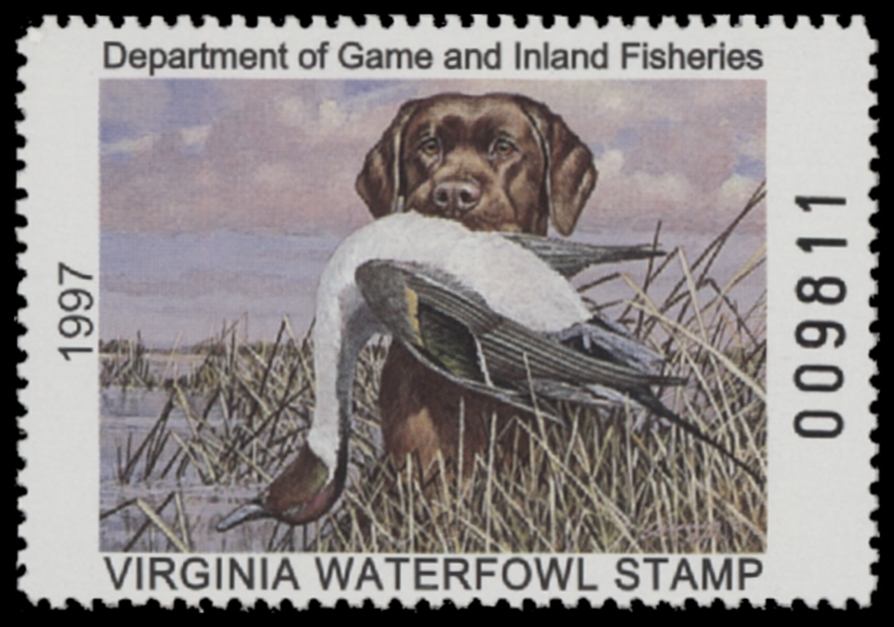 VA10 1997 State Duck Stamp. Mint Never Hinged. Very Fine. Retriever & Pintail by Roger Cruwys.