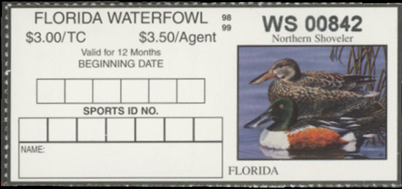 FL20 1998 State Duck Stamp. Mint Never Hinged. Very Fine. Pair of Shovlers by Brian Blight.