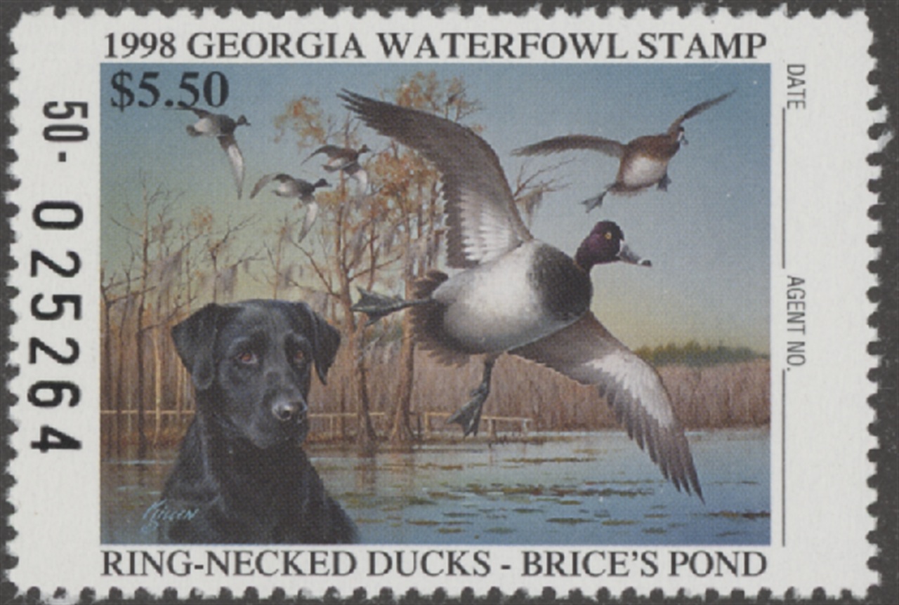 GA14 1998 State Duck Stamp. Mint Never Hinged. Very Fine. Ring-neck Ducks and a Black Lab by Jim killen.
