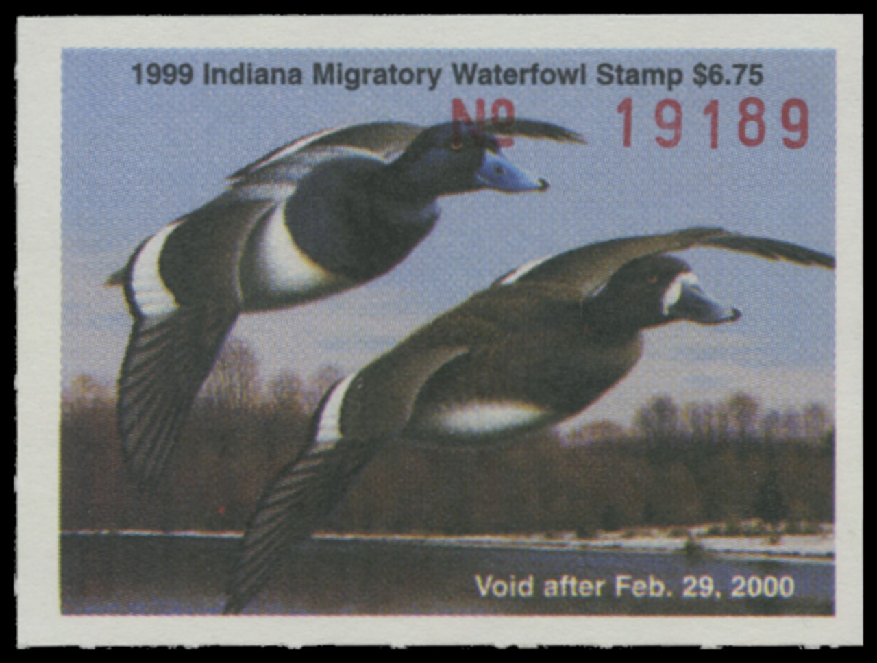 IN24 1999 State Duck Stamp. Mint Never Hinged. Very Fine. Bluebills by Chuck Riggles.