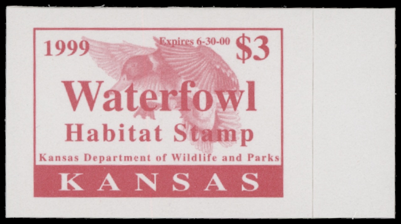 KS13 1999 State Duck Stamp. Mint Never Hinged. Very Fine.