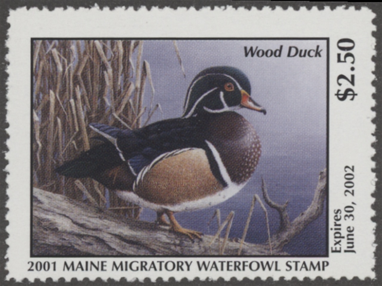 ME18 2001 State Duck Stamp. Mint Never Hinged. Very Fine. Wood Duck by Jeannine Staples.