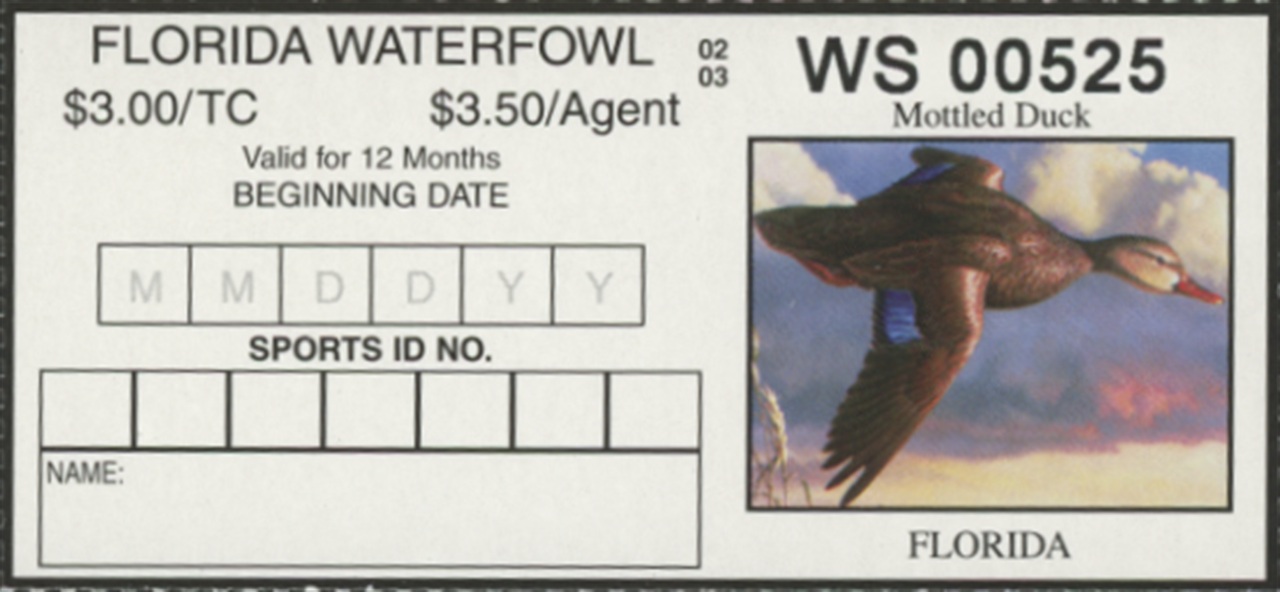 FL24A 2002 State Duck Stamp. Mint Never Hinged. Very Fine. Mottled Duck Facing Right (Correct) by John Nelson Harris.