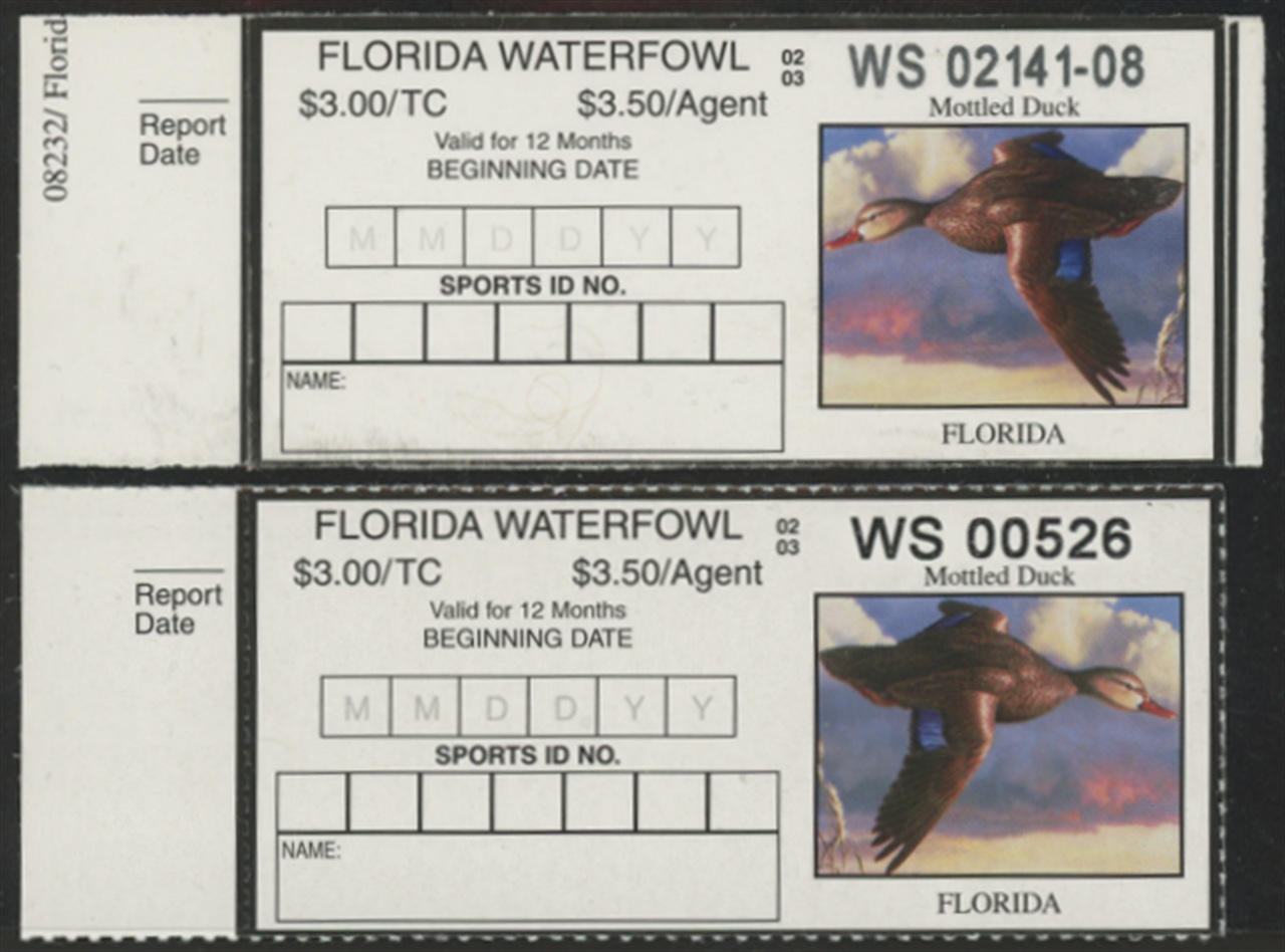 FL24 and 24A 2002 State Duck Stamp. Mint Never Hinged. Very Fine. The original painting showed the duck facing right but the design was accidentally flipped so the duck faced left. Florida reprinted about 1,000 stamps with the duck facing the right direction. Mottled Duck by John Nelson Harris.