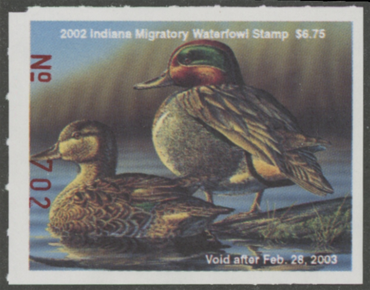 IN27 2002 State Duck Stamp. Mint Never Hinged. Very Fine. Teal by Brian Blight.