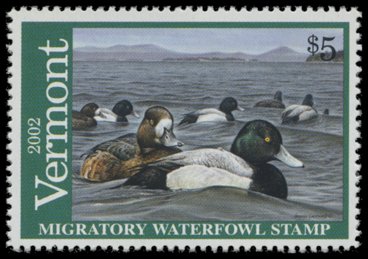 VT17 2002 State Duck Stamp. Mint Never Hinged. Very Fine. Greater Scaup by George Lockwood.