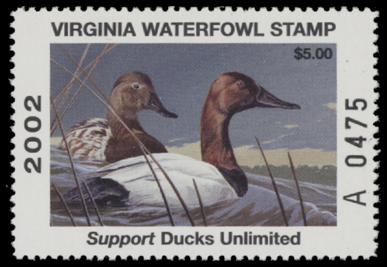VA15 2002 State Duck Stamp. Mint Never Hinged. Very Fine. Canvasbacks by Jim Wilson.