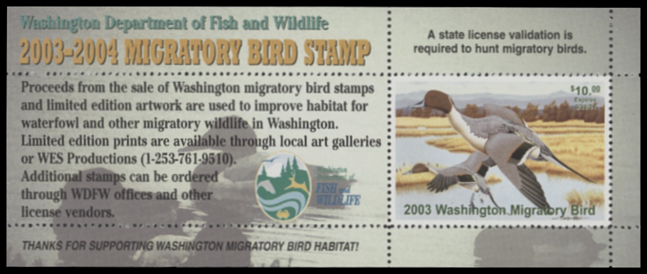 WA18A 2003 State Duck Stamp. Mint Never Hinged. Very Fine. Pintails by Don Nicholson.