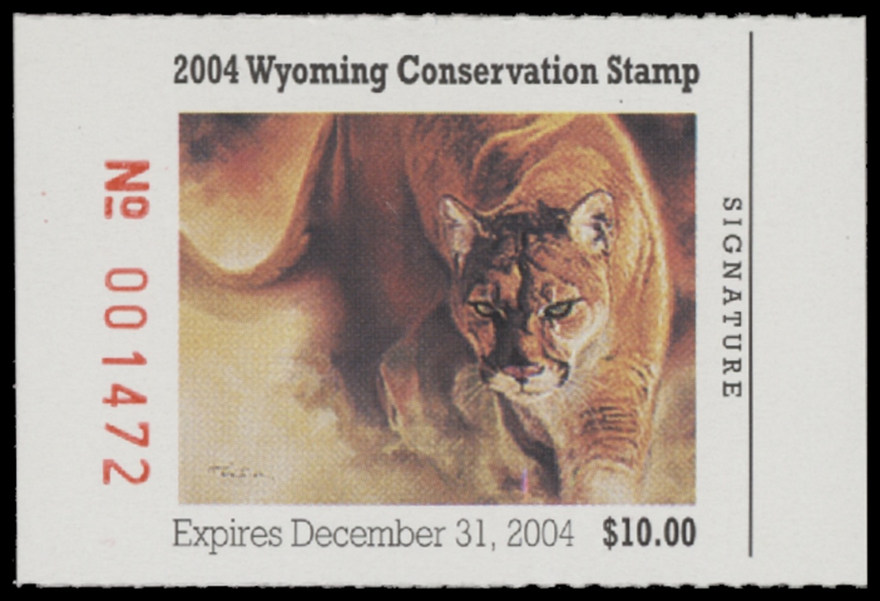 WY21 2004 State Duck Stamp. Mint Never Hinged. Very Fine. Mtn Lion by Dustin Van Wechell.