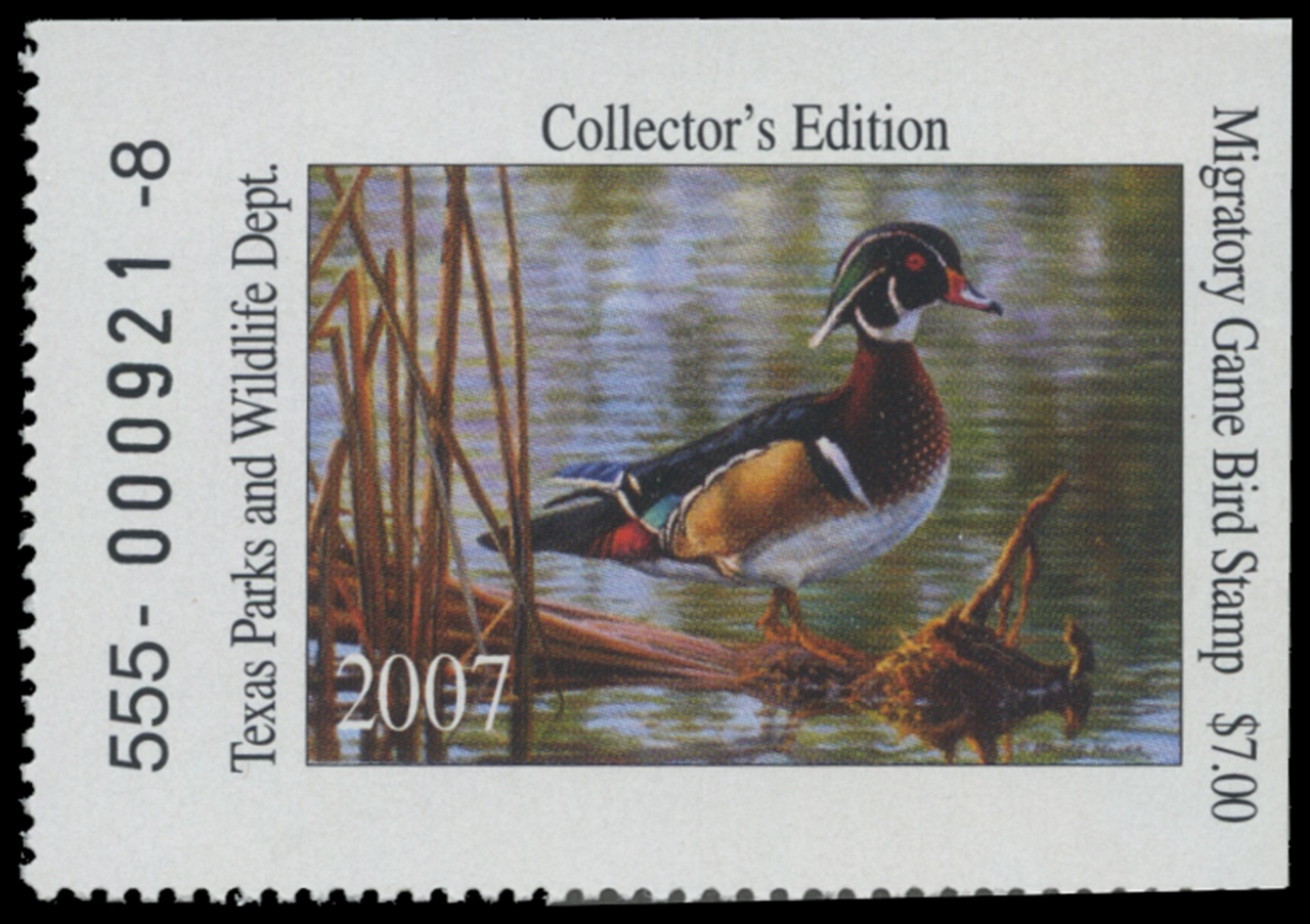 TX27 2007 State Duck Stamp. Mint Never Hinged. Very Fine. Wood Ducks by Bruce Miller.