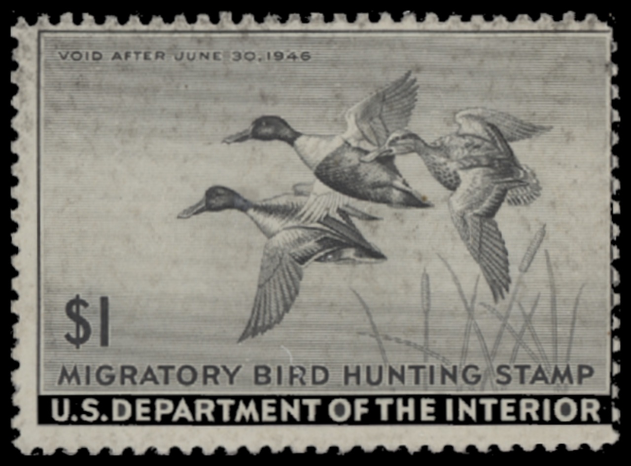 RW12 1945 Federal Duck Stamp. Used. Fine - Very Fine. Shovelers by Owen Gromme.