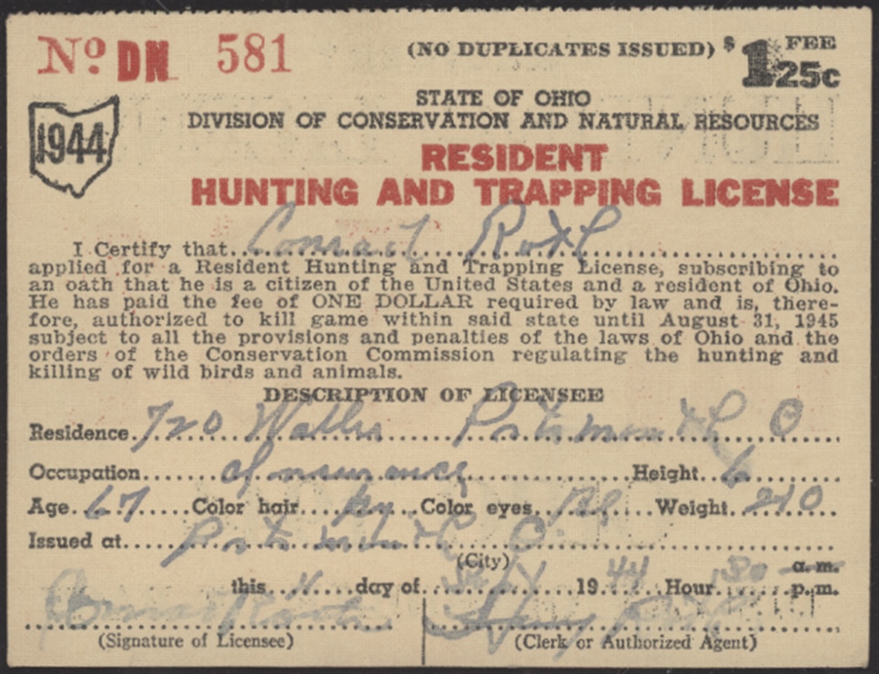 RW12 1945 Federal Duck Stamp. Used on Previous Year (1944) Ohio Resident Hunting and Trapping License. Fine Centering. Shovelers by Owen Gromme.