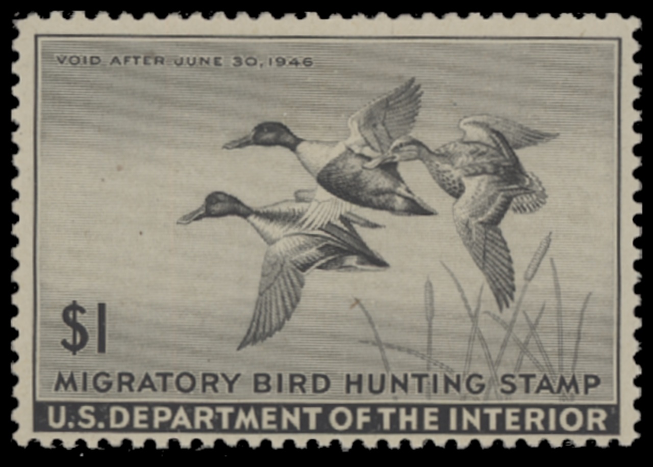 RW12 1945 Federal Duck Stamp. Mint Lightly Hinged. Fine - Very Fine. Shovelers by Owen Gromme.