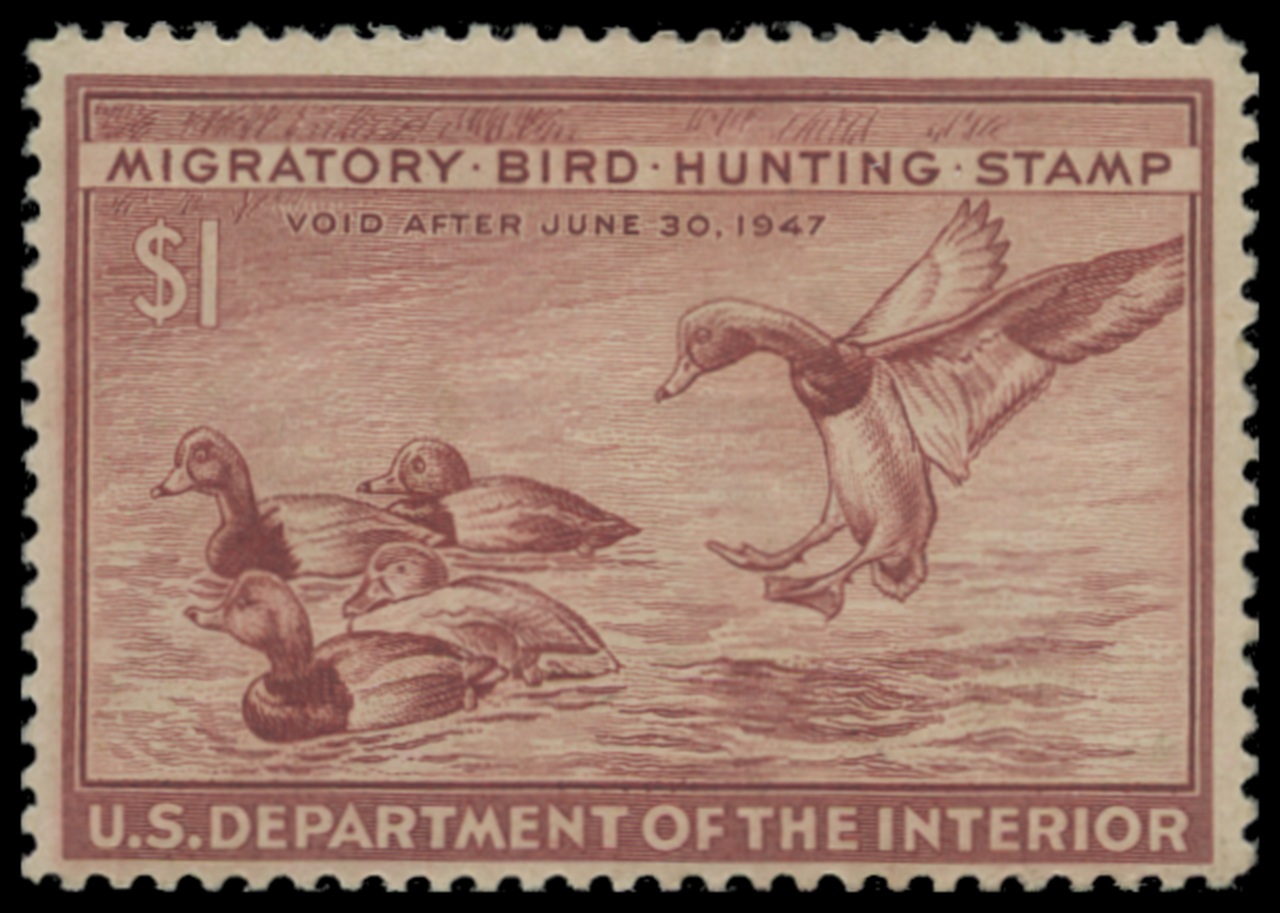 RW13 1946 Federal Duck Stamp. Mint Lightly Hinged. Fine - Very Fine. Redhead Ducks by Robert W. Hines.
