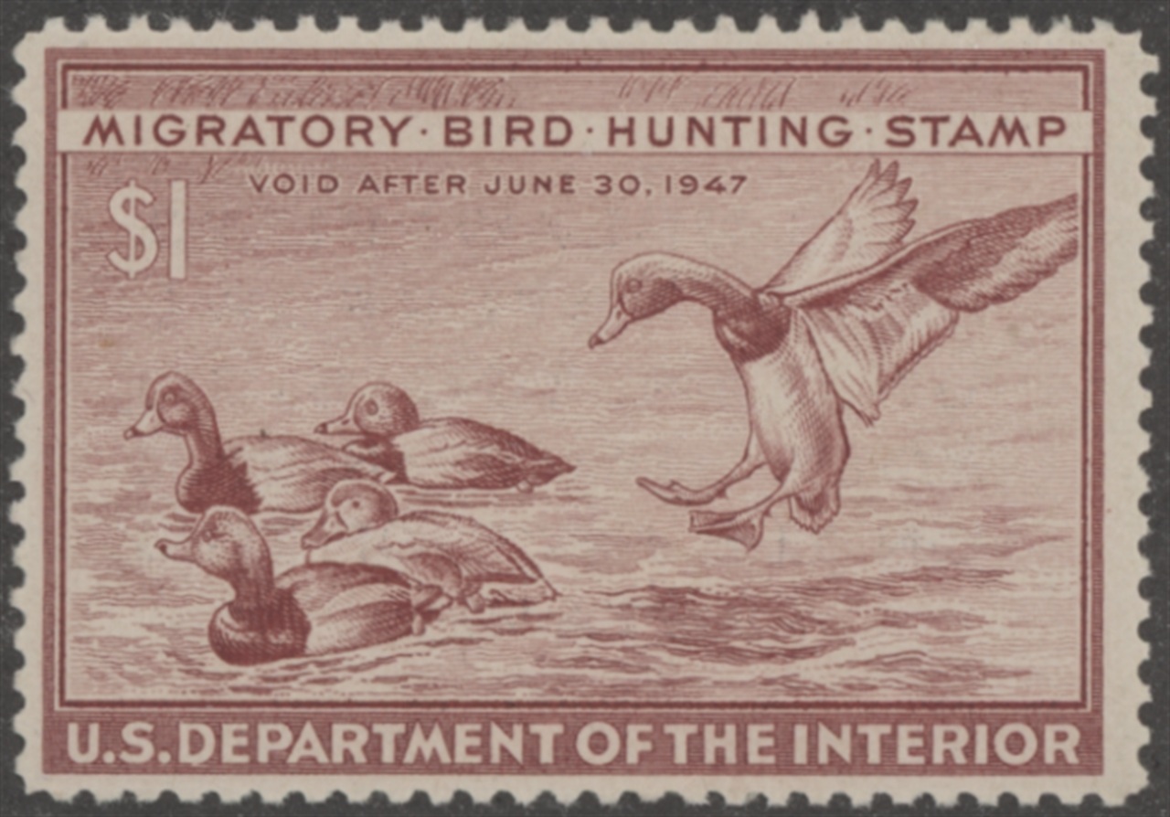 RW13 1946 Federal Duck Stamp. Mint Never Hinged. Fine - Very Fine Centering. Redhead Ducks by Robert W. Hines.