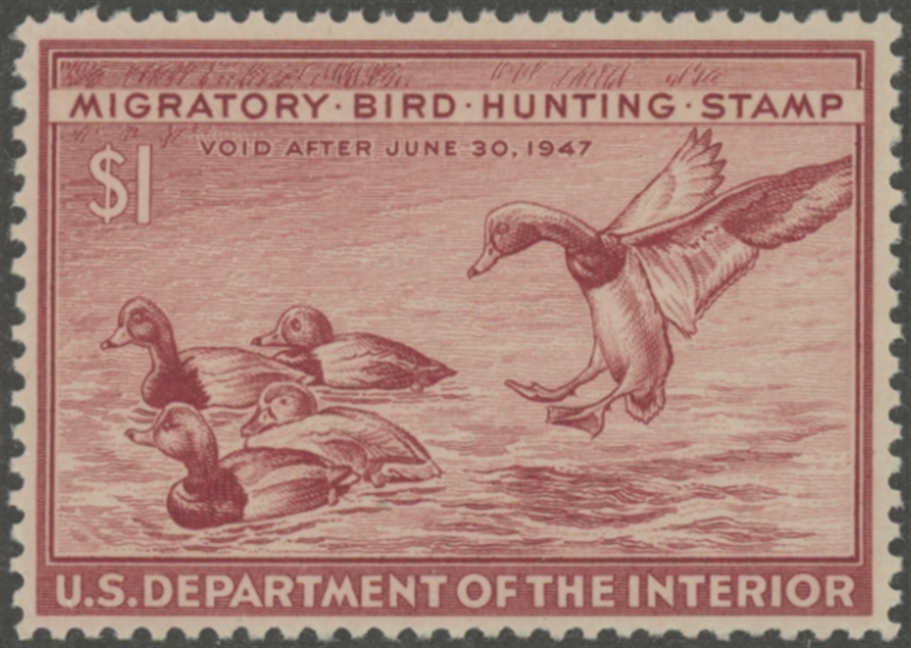 RW13 1946 Federal Duck Stamp. Mint Never Hinged. Very Fine Centering. Redhead Ducks by Robert W. Hines.