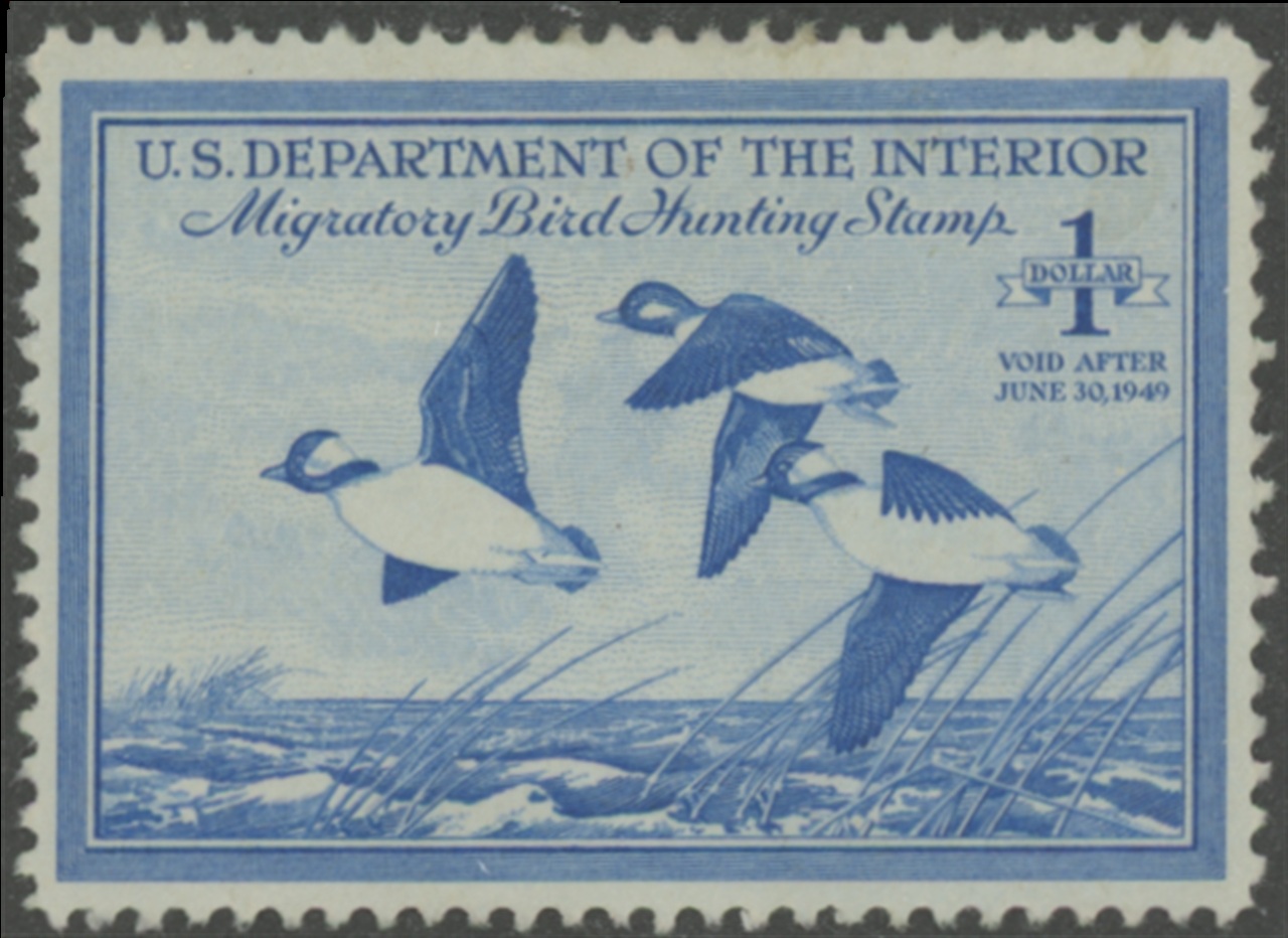 RW15 1948 Federal Duck Stamp. Unsigned, No Gum. Fine - Very Fine Centering. Buffleheads by Maynard Reese.