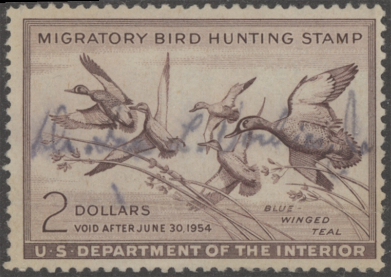RW20 1953 Federal Duck Stamp. Used. Fine - Very Fine. Blue-wing Teal by Clayton Seagears.
