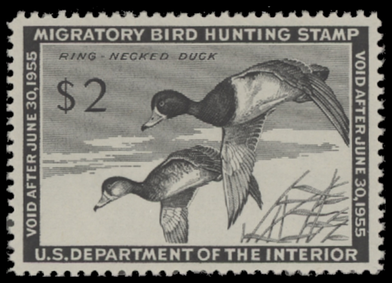 RW21 1954 Federal Duck Stamp. Mint Lightly Hinged. Fine - Very Fine. Ring-necked Duck by Harvey Sandstrom.
