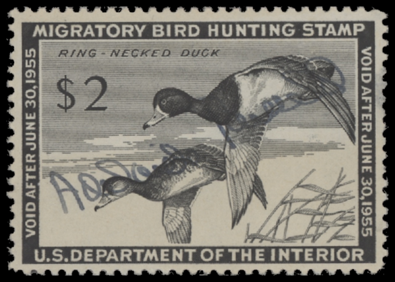 RW21 1954 Federal Duck Stamp. Used. Fine - Very Fine. Ring-necked Duck by Harvey Sandstrom.