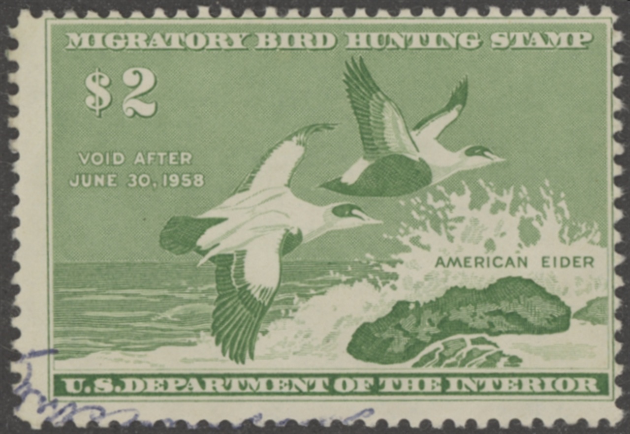 RW24 1957 Federal Duck Stamp. Used. Very Good Centering, Most Orignial Gum Remains. American Eiders by Jackson Miles Abbot.