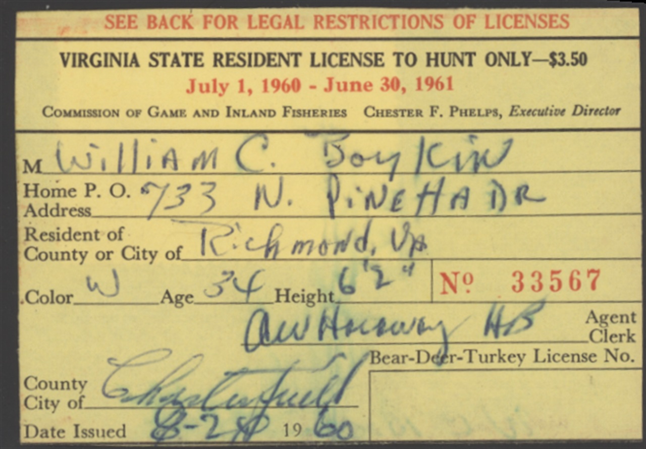RW27 1960 Federal Duck Stamp. Used on Virginia Resident License To Hunt. Fine - Very Fine Centering. Redhead Ducks by John Ruthven.
