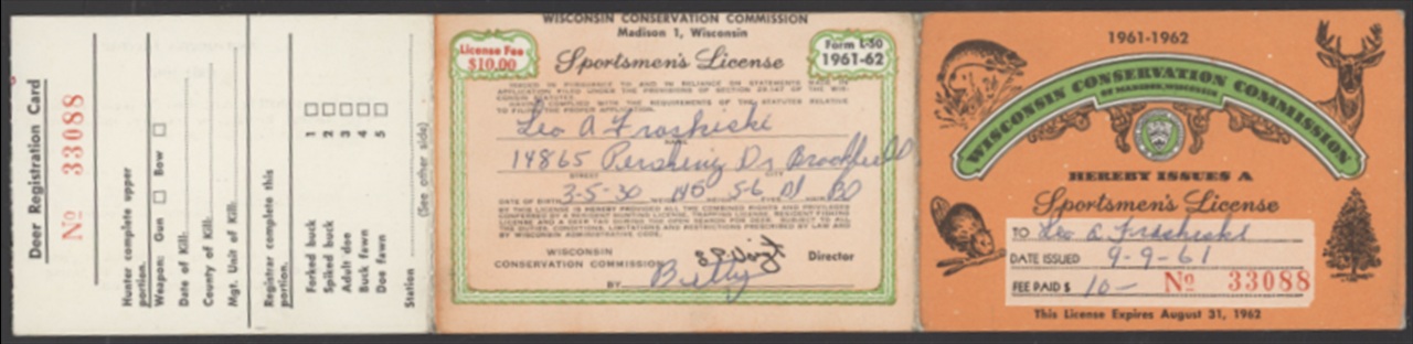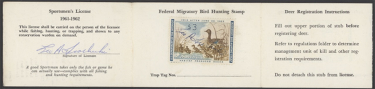 RW28 1961 Federal Duck Stamp. Used on 1961 Wisconsin Sportsman's License. Fine - Very Fine. Mallard Brood by Edward Morris.