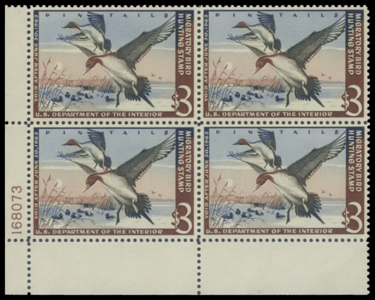 RW29 1962 Federal Duck Stamp. Mint Never Hinged. Fine - Very Fine. Plate block of 4. Pintails by Edward Morris.