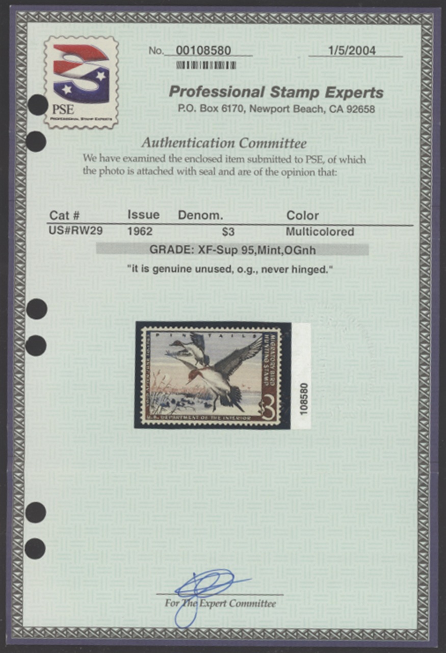 RW29 1962 Federal Duck Stamp. Mint Never Hinged. Graded Extra Fine - Superb 95 with PSE Certificate. Pintails by Edward Morris.