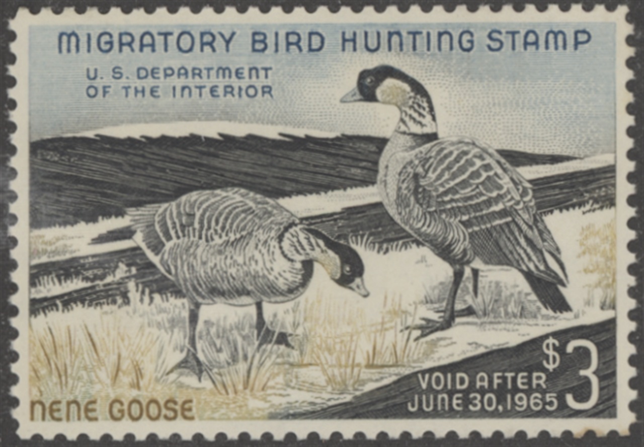 RW31 1964 Federal Duck Stamp. Mint Never Hinged But Slight Gum Disturbance Due to 'Poor Mounting Practices'. Extra Fine Centering. Nene Goose by Stanley Sterns.