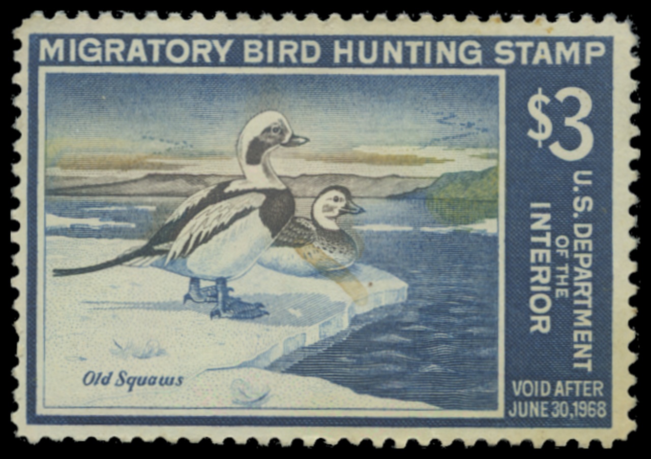 RW34 1967 Federal Duck Stamp. Mint Lightly Hinged. Fine - Very Fine. Old Squaws by Les Kouba.