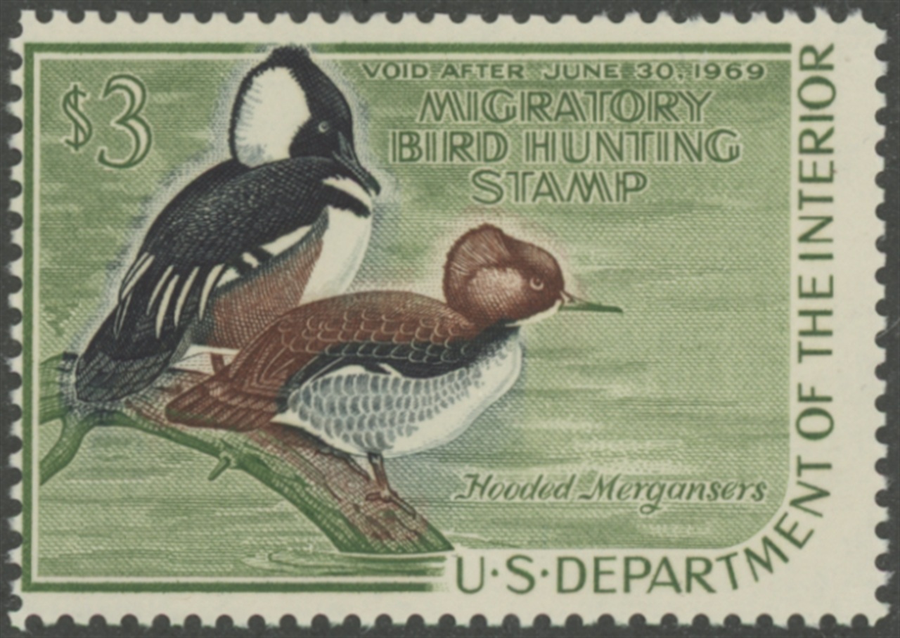 RW35 1968 Federal Duck Stamp. Mint Lightly Hinged. Hooded Mergansers by C. G. Pritchard.