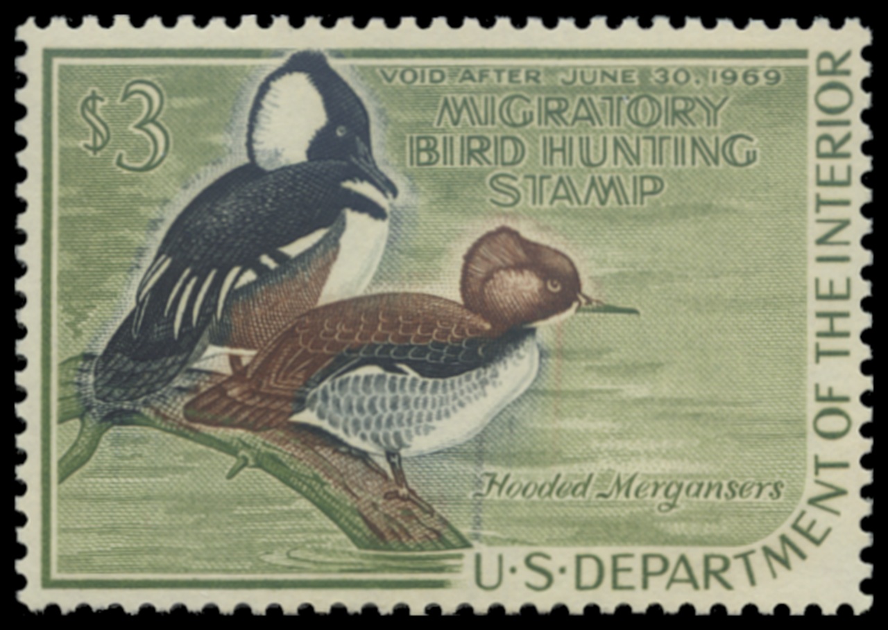 RW35 1968 Federal Duck Stamp. Mint Never Hinged. Fine - Very Fine. Hooded Merganser by C.G. Prichard.
