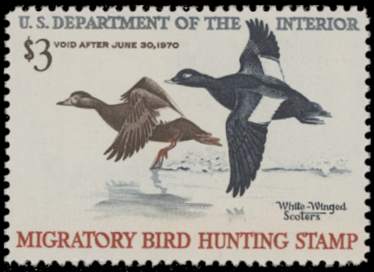 RW36 1969 Federal Duck Stamp. Mint Lightly Hinged. Fine - Very Fine. White-winged Scoters by Maynard Reece.
