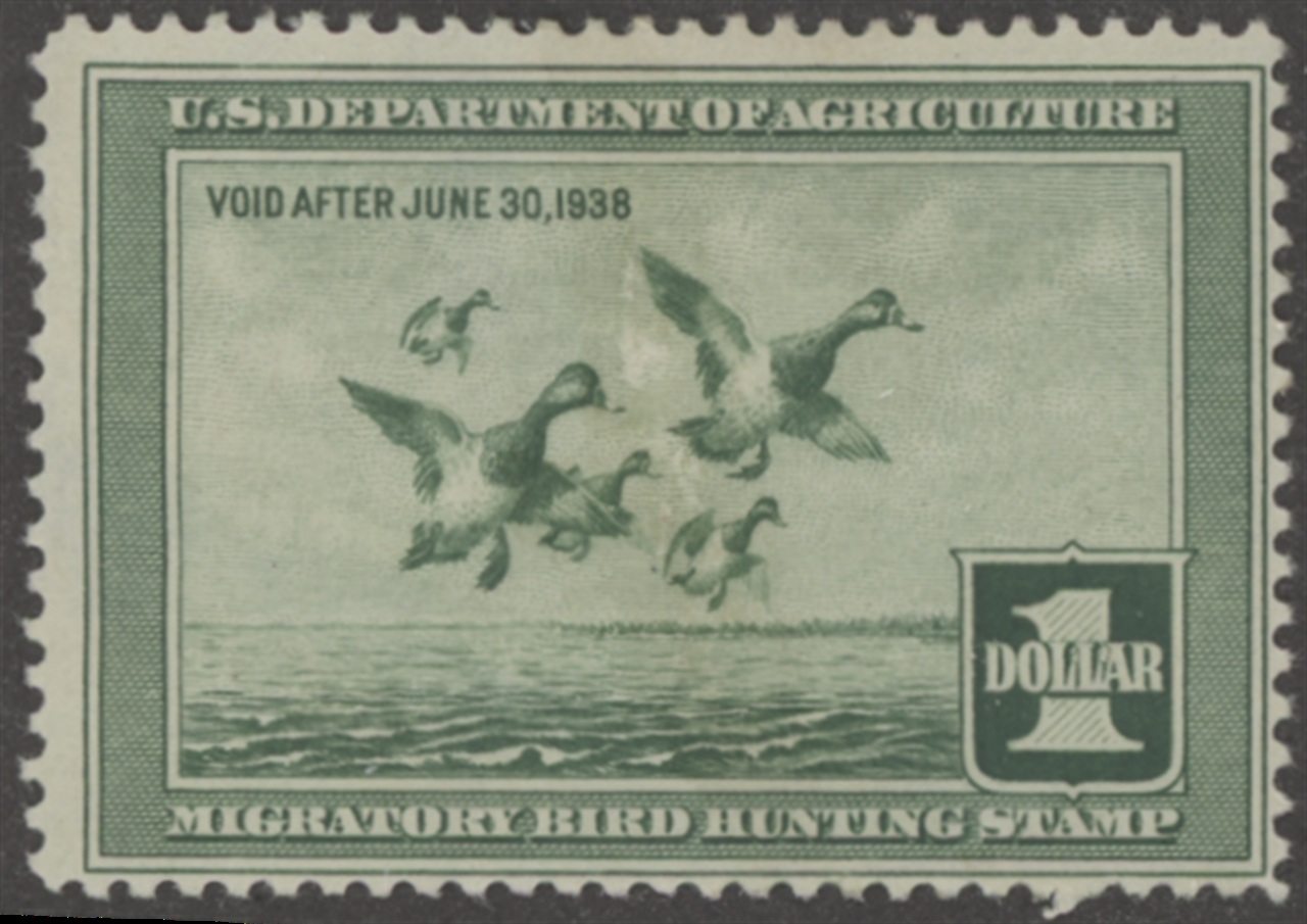 RW4 1937 Federal Duck Stamp. Unsigned, No Gum, Vertical Crease, Thins. Fine Centering. Scaup Taking to Flight by J. D. Knap.