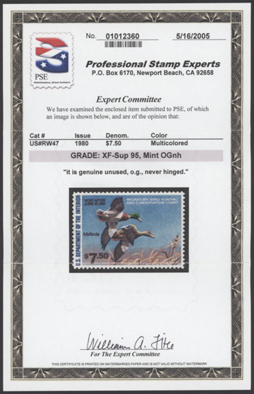 RW47 1980 Federal Duck Stamp. Mint Never Hinged. Graded XF-Superb 95 with PSE Certificate. Mallards by Richard Plasschaert.