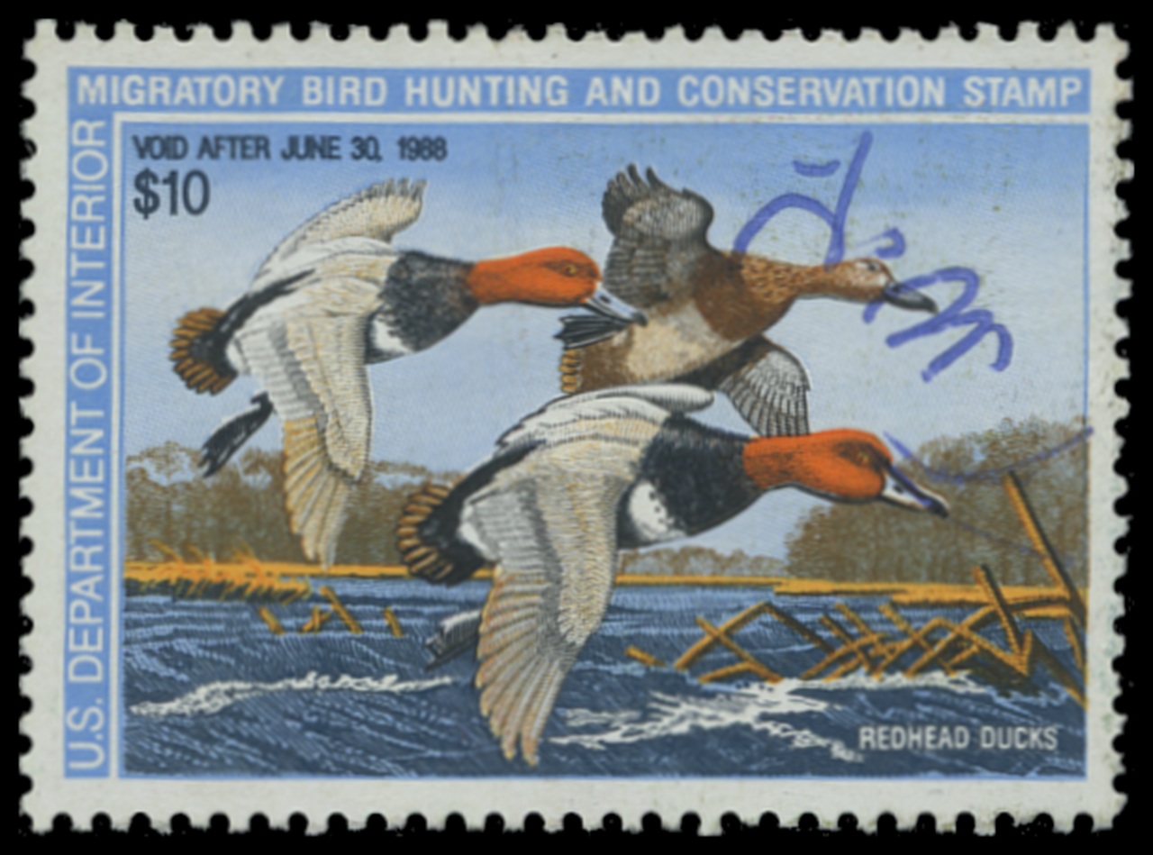 RW54 1987 Federal Duck Stamp. Used. Fine - Very Fine. Redhead Ducks by Arthur G. Anderson.