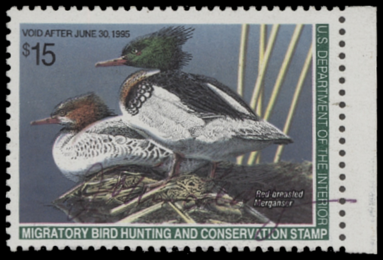 RW61 1994 Federal Duck Stamp. Used. Fine - Very Fine. Red-breasted Merganser by Neal R. Anderson.