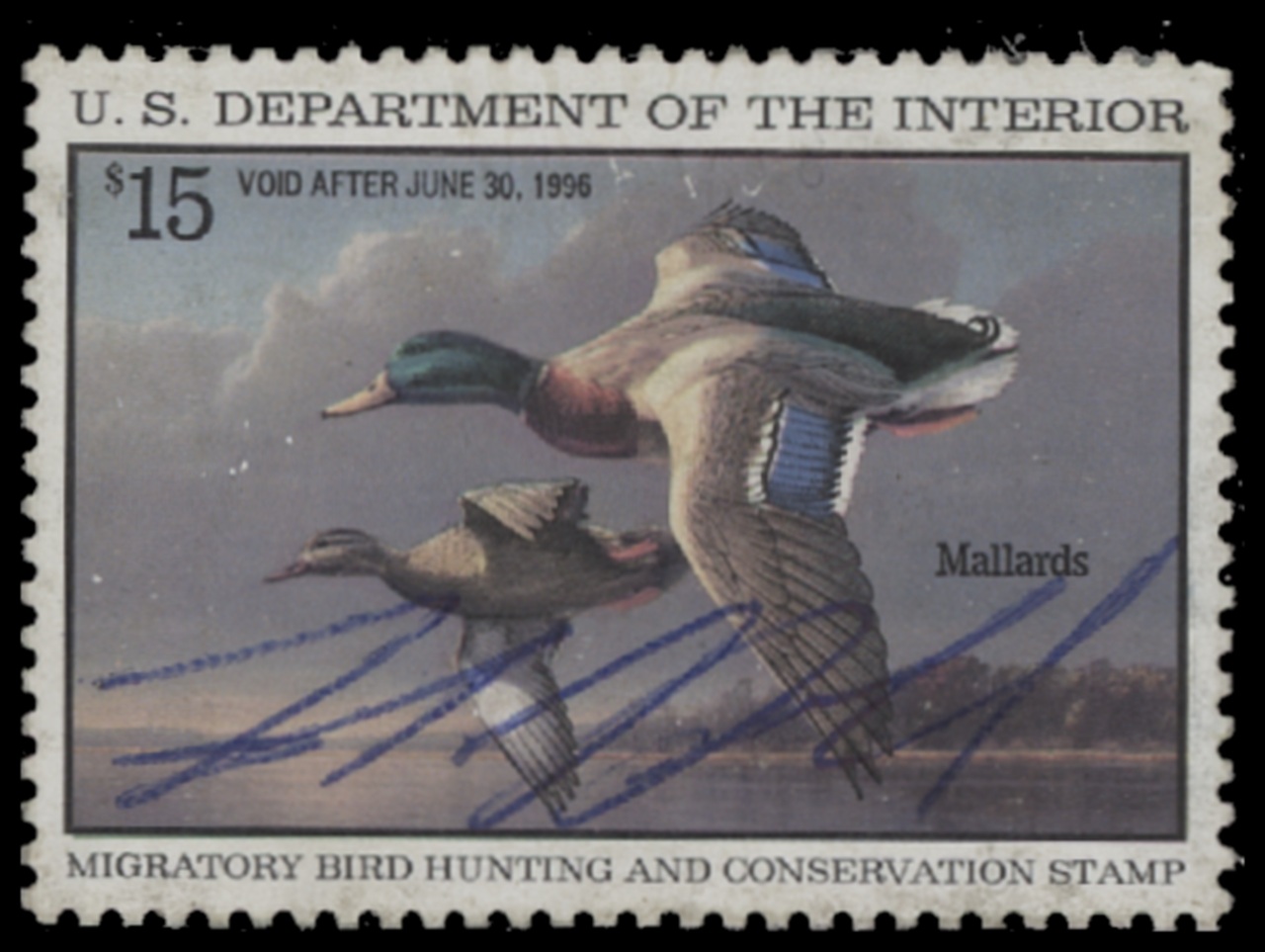 RW62 1995 Federal Duck Stamp. Used. Fine - Very Fine. Mallards by Jim Hautman.