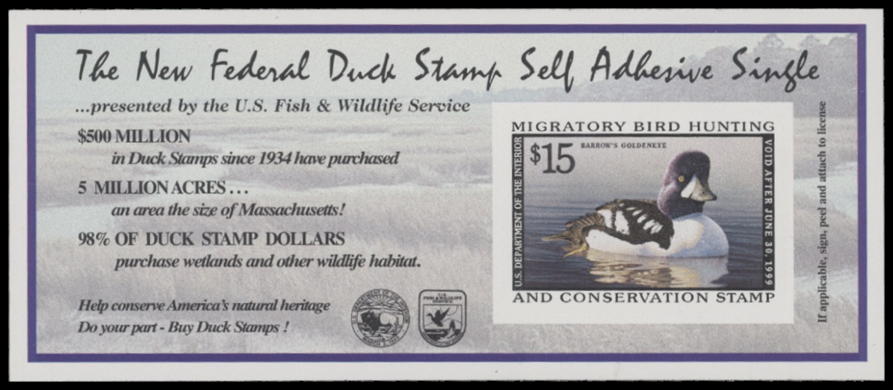 RW65A 1998 Federal Duck Stamp. Mint Never Hinged. Fine - Very Fine. Barrow's Goldeneye by Robert Steiner.