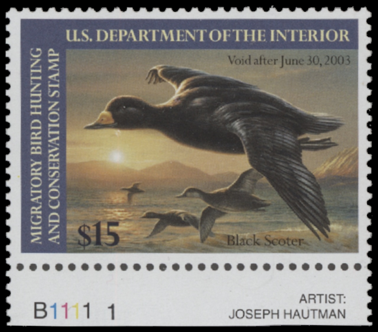 RW69 2002 Federal Duck Stamp. Mint Light Hinge Mark. Very Fine. Black Scoters by Joe Hautman.